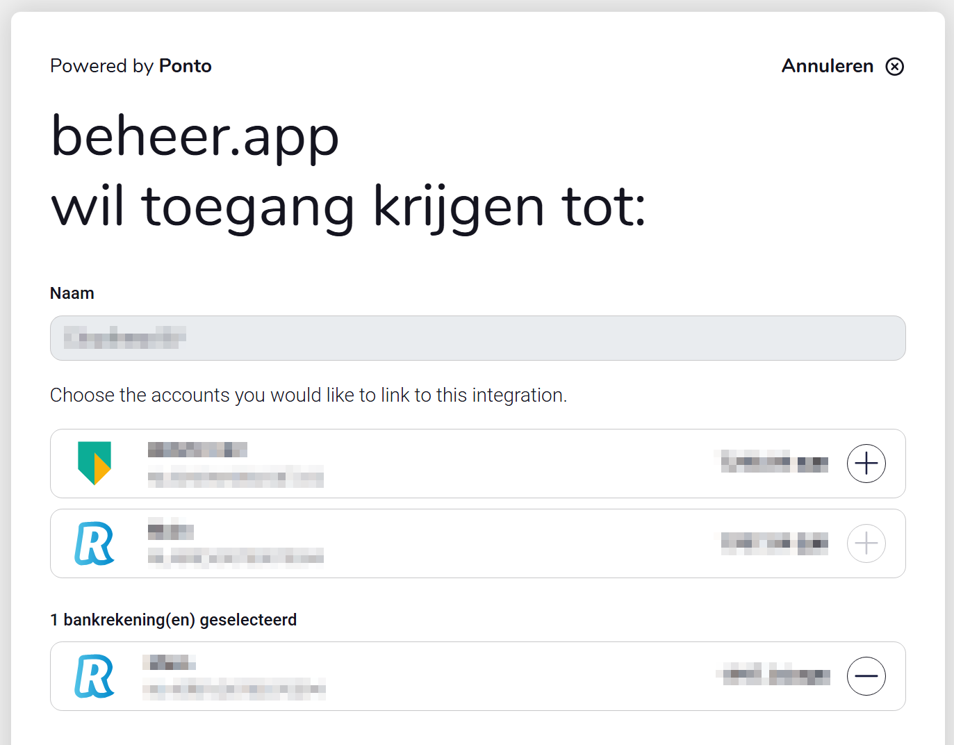 Selecteer de rekeningen om met Beheer.app te koppelen door op + naast de rekening te klikken.