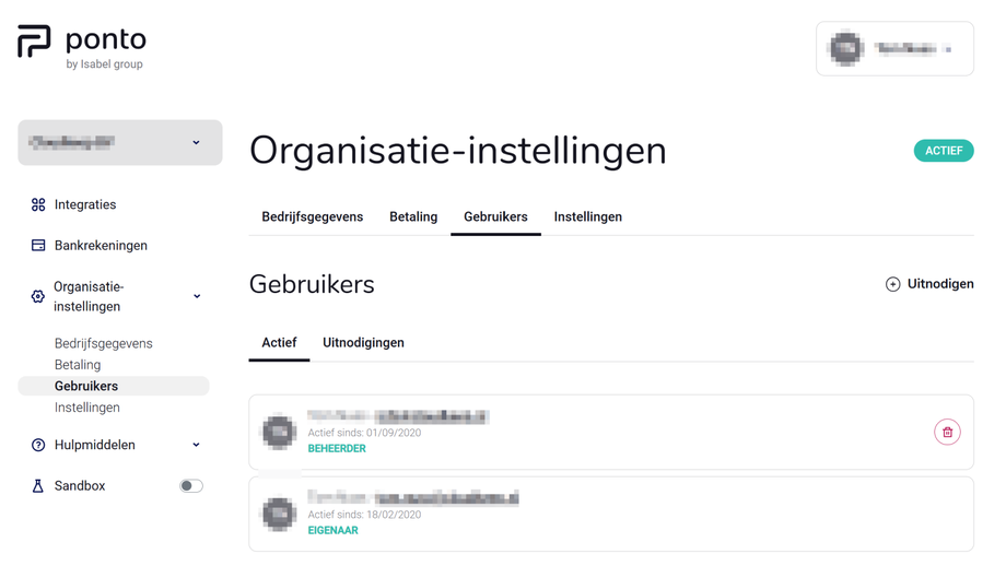 Ponto extra gebruiker aanmaken Nadat je ingelogd bent in Ponto kan je via Organisatieinstellingen > Gebruikers klikken op + Uitnodigen om extra gebruikers aan het Ponto account toe te voegen.