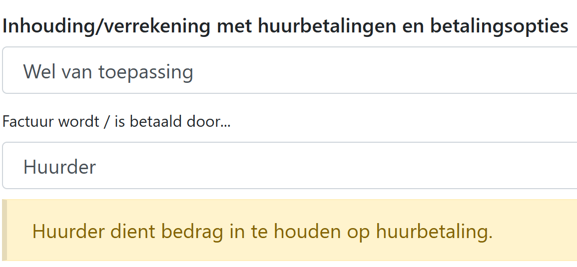 Volg de instructies op het scherm. Onderin kies je bij de opties Inhouding/verrekening voor 'Wel van toepassing' en betaald door 'Huurder'. Bevestig.