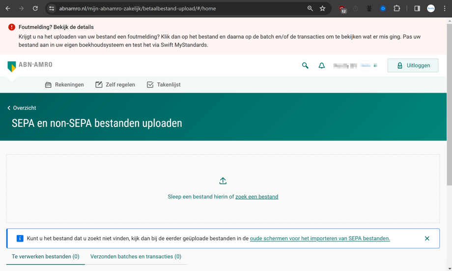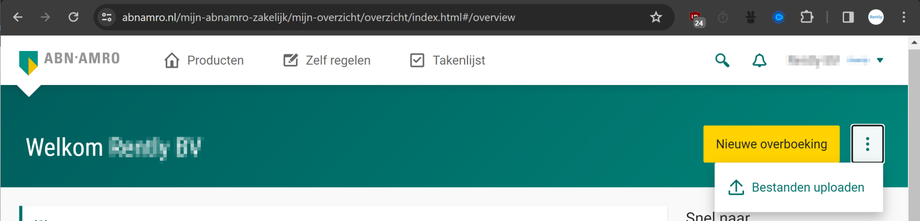Log in bij ABN AMRO internetbankieren. Klik rechts naast "Nieuwe overboeking" op de 3 puntjes onder elkaar, selecteer 'Bestanden uploaden'.