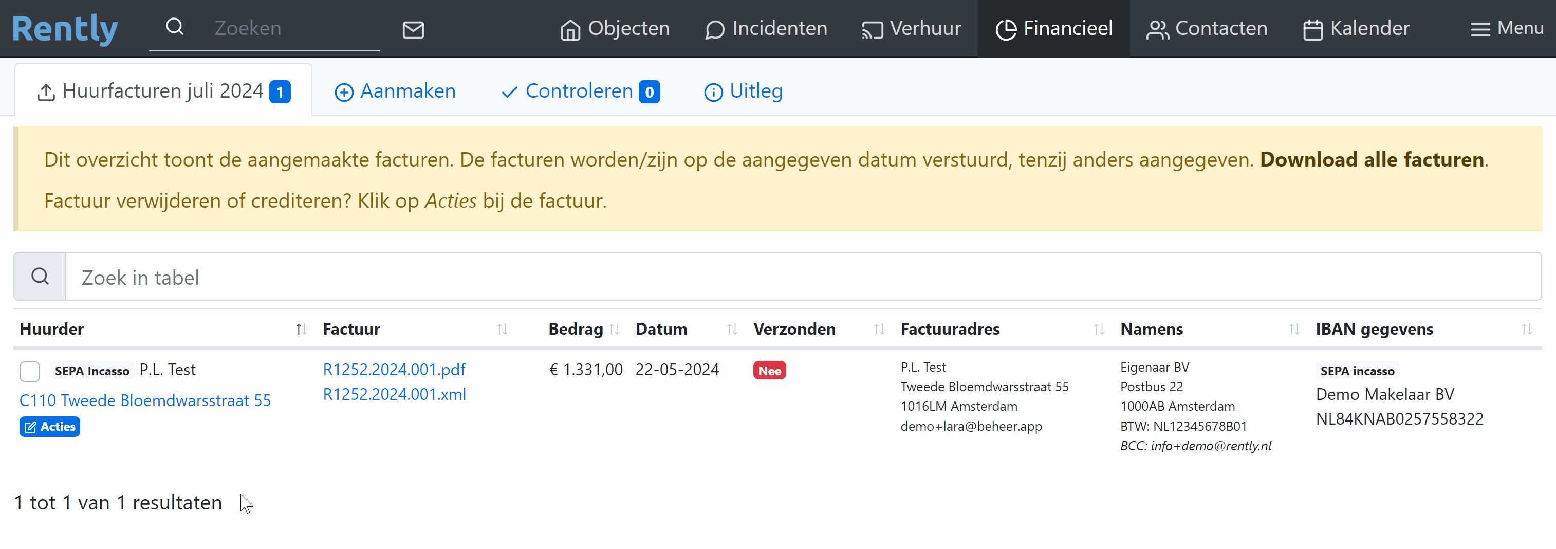 Zodra een factuur gecrediteerd wordt, wordt deze in concept klaar gezet in de tab "Controleren". In de tab "Aanmaken" is de reguliere huurfactuur weer beschikbaar om aan te maken (met de eventueel bijgewerkte gegevens uit de desbetreffende huurprijsperiode).