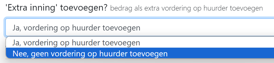 Het extra bedrag kan via een Huurfactuur toegevoegd worden (extra factuurregel toevoegen, met 'Extra inning': ja) of kan als losse "Extra inning" toegevoegd worden. Daarmee wordt de vordering op de huurder verhoogd.