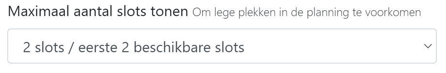Eén van de vragen is "Maximaal aantal slots" tonen. Als gekozen wordt om niet alle beschikbare slots te tonen, maar bijvoorbeeld "2 slots" betekent dit dat maximaal 2 slots getoond worden. De vroegst beschikbare slots worden getoond. Dit beoogt te voorkomen dat er lege plekken ontstaan in de planning